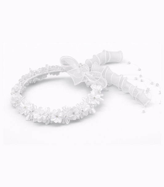 White Satin Floral Hair Wreath with Pearls, First Communion & Flower Girl