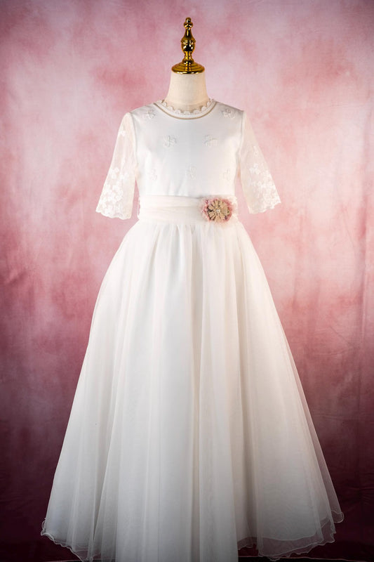 LUCIA - First Communion Dress: Natural White Chiffon Gown, Full Skirt, Made in Spain