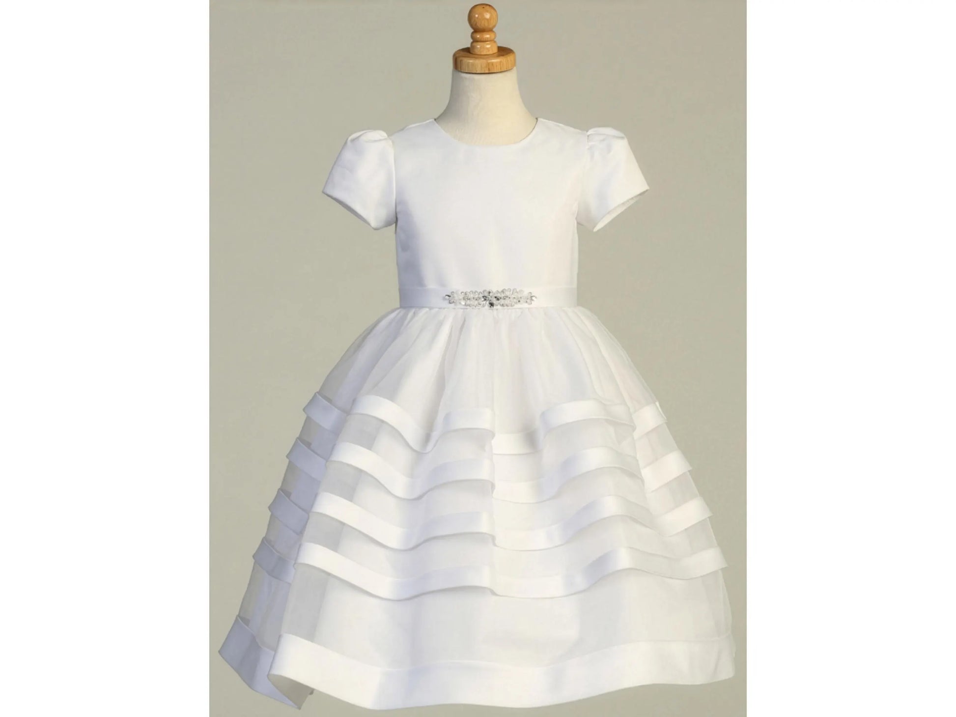 Renata White Satin & Organza Dress – First Communion, Flower Girl, Baptism | Tea-Length Elegant Occasion Dress